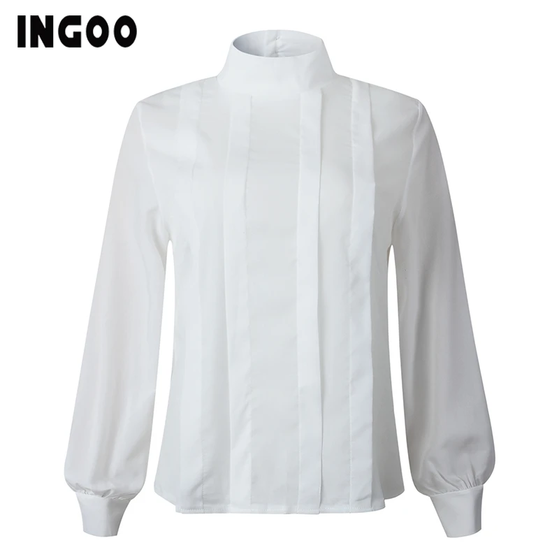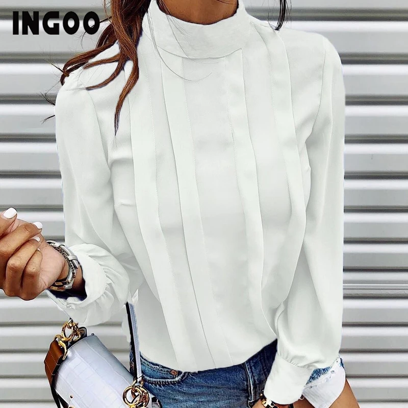discount INGOO Autumn Turtleneck Office Women Shirt Lantern Long Sleeve Ruched Pleated Blouses Button Elegan
