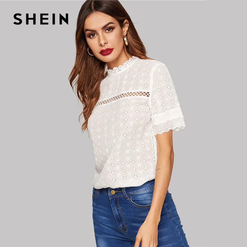 Greatest SHEIN Eyelet Embroidered Lace Insert Mock Neck Solid Blouse Summer Stand Collar Bohemian Cotton Wom