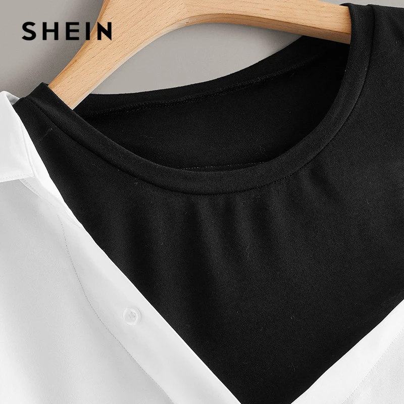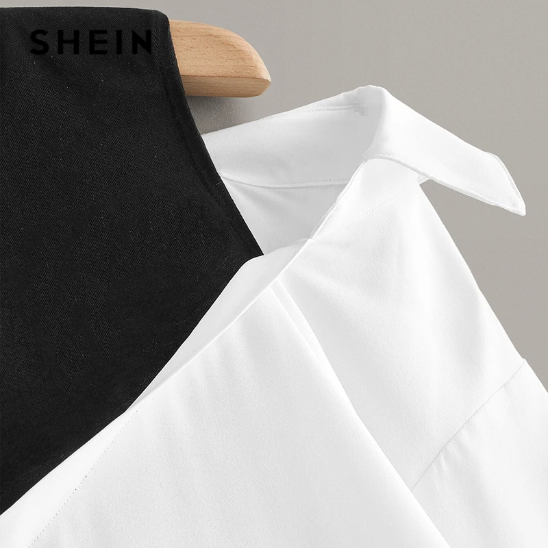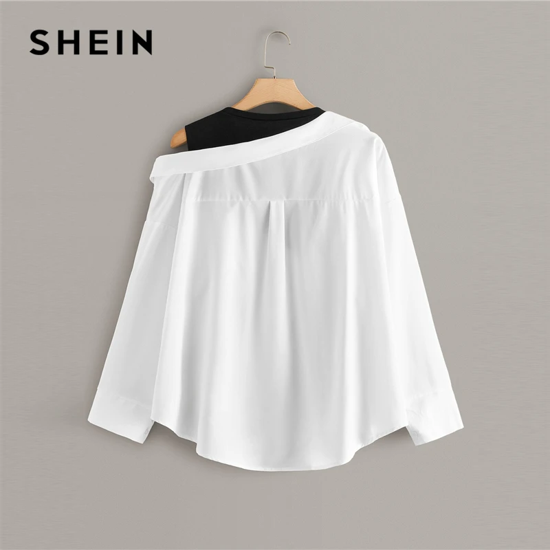 discounted SHEIN Plus Size White Contrast Panel Asymmetrical Neck Blouse Women Tops Autumn Pocket Colorblock O