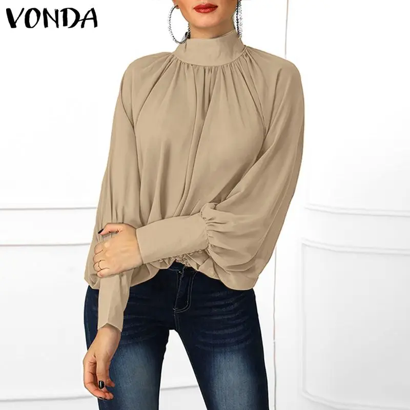 astounding VONDA Plus Size Blouse Women 2019 Spring Tunic Sexy O Neck Long Lantern Sleeve Shirts Casual Loose