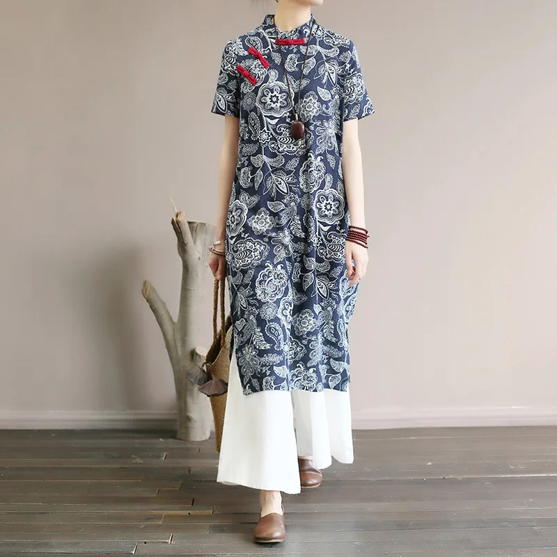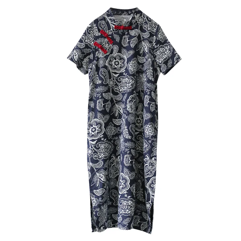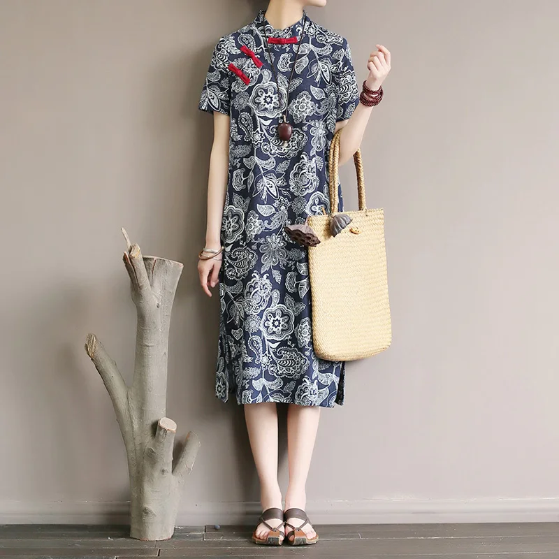 discounted Republic of China style women's dress with improved retro buckle dress summer short sleeve long